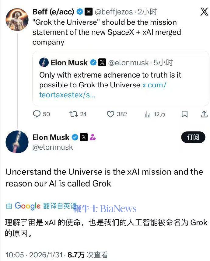 1月31日,有网友在社交平台上引用马斯克言论“Only with extreme adherence to truth is it possibleto Grok the Universe(唯有极致坚守真相,方能洞悉宇宙)”,称"Grok the Universe"应该是SpaceX与xAI合并后的新公司的使命宣言。