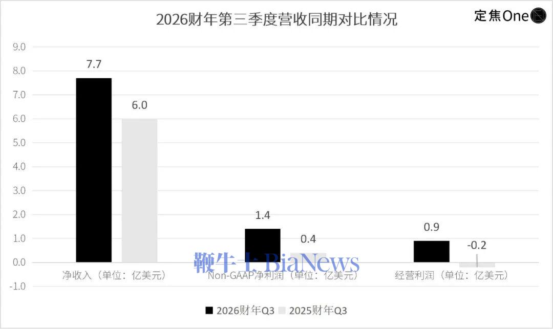 1月29日,好未来公布2026财年三季度(对应自然年2025年9月1日至2025年11月30日)财报。财报显示,第三季度收入为7.7亿美元,同比增幅27%,Non-GAAP净利润(以下净利润均为Non-GAAP口径)1.4亿美元,同比增长266.6%;前三季度累计营收为22.1亿美元,同比增幅34.5%,Non-GAAP净利润3.2亿美元,同比增长124%。