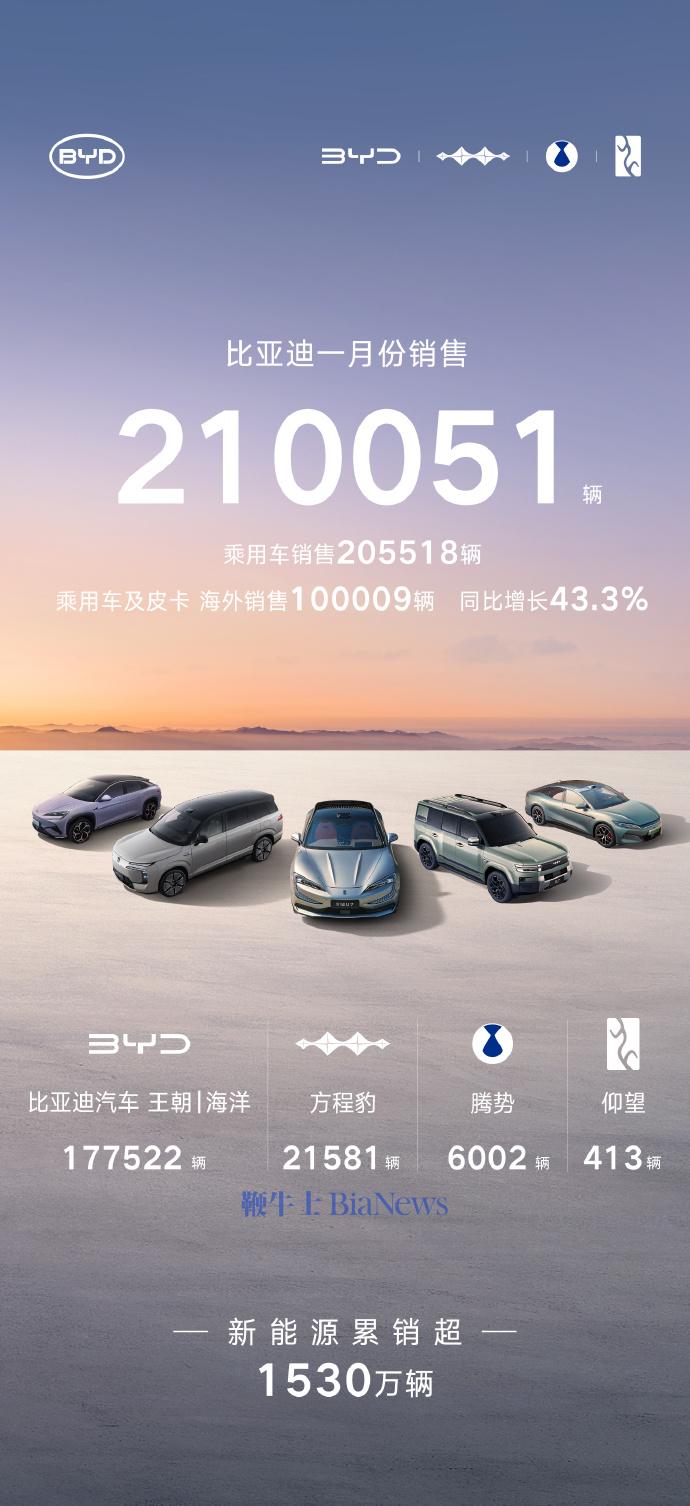 2026年1月,比亚迪新能源汽车销量达210051辆,同比下滑30.11%。