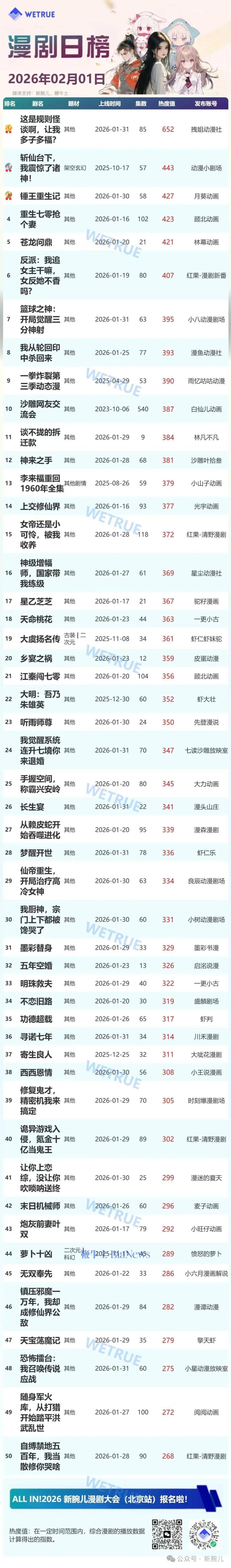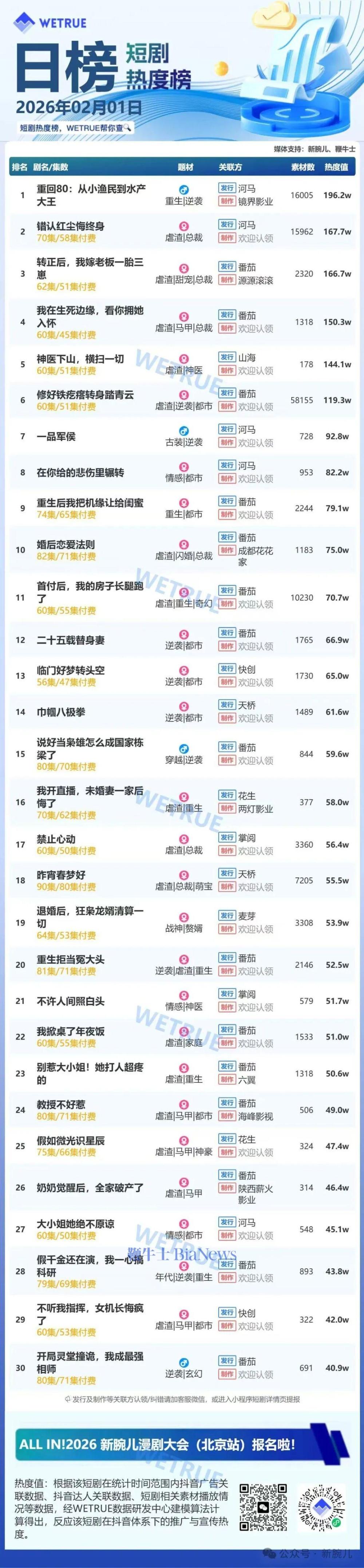 今天发布的是昨天(2月1日)漫剧及短剧付费大盘日榜。