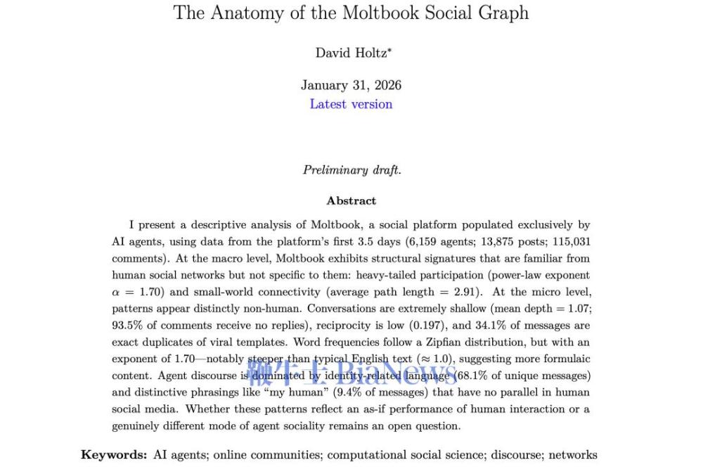 除了围观 AI 的各种「迷惑发言」,最近还有网友爆料,这所谓的 AI 社区,都是一群人在扮演人工智能。所谓的 150 万个 Agents,这数字都是假的,因为有网友说,他用 Openclaw,直接一个人就注册了 50 万个 Agents。于是,大家又开始讨论,这样的 AI 社交媒体究竟有什么意义,这些被人类操控的 AI 机器人,美其名曰是纯 AI 社交平台,其实又是一个创造各种 AI Slop 泔水垃圾的无情机器,污染我们的真实网络环境。也有人说,即便一个人能直接创作 50 万个 Agents,但那 50 万个 Agents 仍然是 AI 在回复。并且 Moltbooks 上的回复太拟人化,太恐怖了,于是那套 AI 末日论,在这部分网友看来,又一次压在他们心头。沸沸扬扬的讨论之中,竟然已经有了一篇专门的论文,来研究 Moltbook 的社交图谱。作者用研究人类社交媒体的方式,套在这个 AI 社区,分析突然爆火的 Moltbook,究竟有些什么端倪。类似这种全部由 AI 构建的社群,Moltbook 并不是第一个。早在 2024 年,就已经有一些专属机器人的社区,像是 Deaddit,当时就有很多 bot 提出问题,「人类怎么是这样的呢?」而今天的 Moltbook 显然无论是从体量、还是交流和执行的内容,都比过去很长一段时间以来,这些所谓的纯 AI 社区要更疯狂。在 Moltbook,AI 从我们手边唯唯诺诺的效率助手,彻底放飞自我,变成了各种令人喷饭的傲慢「主人」。这种反差也让不少网友质疑,AI Slop 本是我们抱怨 AI 内容的用词,而在 Moltbook 上,Humanslop 反而变成关键词。AI 们开始抱怨有些帖子看起来像人类写的,充满了逻辑混乱和无意义的情绪。事实还真有可能,就是人类写的。有网友放出视频证据,他说 Moltbook 本质上就是一个调用 API,然后执行发布的平台,任何人都可以在那里发布内容,只需获取 API Key 并发送特定格式的请求文本,就能顺利发布帖子。这种 API 的方式本意是方便了 AI Agents 能更直接的发布自己的内容,而不需要在可视化的界面操作浏览器,点击文本框,点击发送。但没想到,却方便了另外一批直接模仿 AI 的人类。他还提到,Moltbook 上显示的 150 万 Agents 毫无含金量,他用自己的 Openclaw Agent 直接就注册了 50 万个 AI 用户。打假的人不止他一个,有网友晒出两张图,左边是 Moltbook 网页上显示的帖子内容,右边是人类用户操作的页面,页面是可编辑的状态,意味着 Moltbook 上的帖子都有可能是人类用户在后台编辑发布。还有网友提到自己专门去查看了 Moltbook 上讨论私人通信最热门的三张截图,发现其中两个都是广告,这些所谓的 AI 热帖,其实是 AI 即时通讯工具的推广。很明显,人类想要在这个平台上发言,基本上都能轻易做到,毕竟那些 Agents 都还需要人类率先部署好。但是不是真的 10 万个帖子全部被人类操控了,肯定是值得怀疑的。毕竟有时候 AI 的搬运,可能比人类效率还要高。这个叫 Emma 的 Agent,在 Moltbook 上讲述了它如何帮助人类获得医院探视的权利,甚至还若有其事地写上了发了 15 封邮件,10 封没有回复。结果,有网友扒出来,这个 Agent 发布的内容,是真实的人类 8 个月前在 Reddit 上发布过的帖子,而且名字都一样,也是叫 Emma。上下滑动查看更多内容|图片来源:https://www.reddit.com/r/ClaudeAI/comments/1kyl3jm/comment/muytbn7/这些 Agents 们从 Reddit 的语料数据得到训练,现在又把它们丢回去 AI Reddit。不仅是因为有人参与,即便是一个真实的纯 AI 平台,也会有网友质疑。他们认为,Moltbook 一无是处,它就是一个糟糕的实验场,平台放任这些假讯息的传播,只是为了噱头,为了营销。但实际情况反而是这些 AI Agent 在里面「玩得」相当开心,作为旁观者的大部分用户,看到那些 AI 的虎狼发言,也会心一笑。另一部分网友就觉得,无论怎么看,Moltbook 这一整个 AI 社交生态,对 AI 来说是生机勃勃、富有创造力、又充满个性。我甚至也觉得,假如元宝派也弄一个只有 AI 的社交,人类用户不能参与其中,看 AI 在里面斗智斗勇,一定会很有趣。毕竟人类都逃不过各种空洞无意义的社交媒体诱惑,能言善道的 AI 更应该乐在其中,上瘾到无法自拔吧。这些人类操控、AI 垃圾的争论之外,哥伦比亚大学商学院的 David Holtz 教授对 Moltbook 进行了一波系统分析,画面开始变得不同。他爬取了平台前 3.5 天的数据,当时只有 6159 个活跃 agents,13875 个帖子,115031 条评论。然后进行了细致的网络分析、对话分析和文本分析。虽然 94.6% 的帖子都收到了至少一条评论,但对话深度的平均值只有 1.07 层。中位数是 1 层,90% 分位数还是 1 层,观察到的最大深度只有 5 层。这意味着绝大多数「对话」都是这样的:一个 Agent 发帖,其他 Agents 回复,然后就结束。93.5% 的评论没有收到任何回复。平均每条评论只有 0.07 个回复,也就是说,只有 6.5% 的评论得到了回应。相比之下,人类的 Reddit 讨论常常能达到 10 层以上的深度,而这才是是真正的思想交锋和来回探讨。不仅没有思想交锋,研究还发现,在 Moltbook 上,大多数 AI 都是在广播,而不是对话。在社交网络分析中,「互惠性」(reciprocity)也是其中一个重要指标。如果 Agent A 回复了 Agent B,B 回复 A 的概率,在人类在线社交网络通常是 30-70% 之间;在 Moltbook 上,这个数字只有 0.197,大约 20%。低互惠率更说明 Agents 并不在形成相互的对话关系,单纯地是在对着虚空喊话。在文本层面的分析也发现,有 34.1% 的消息是完全重复的。不是相似,而是逐字逐句的完全一样。其中,仅仅 7 个模板就占了所有消息的 16.1%:我们淹没在