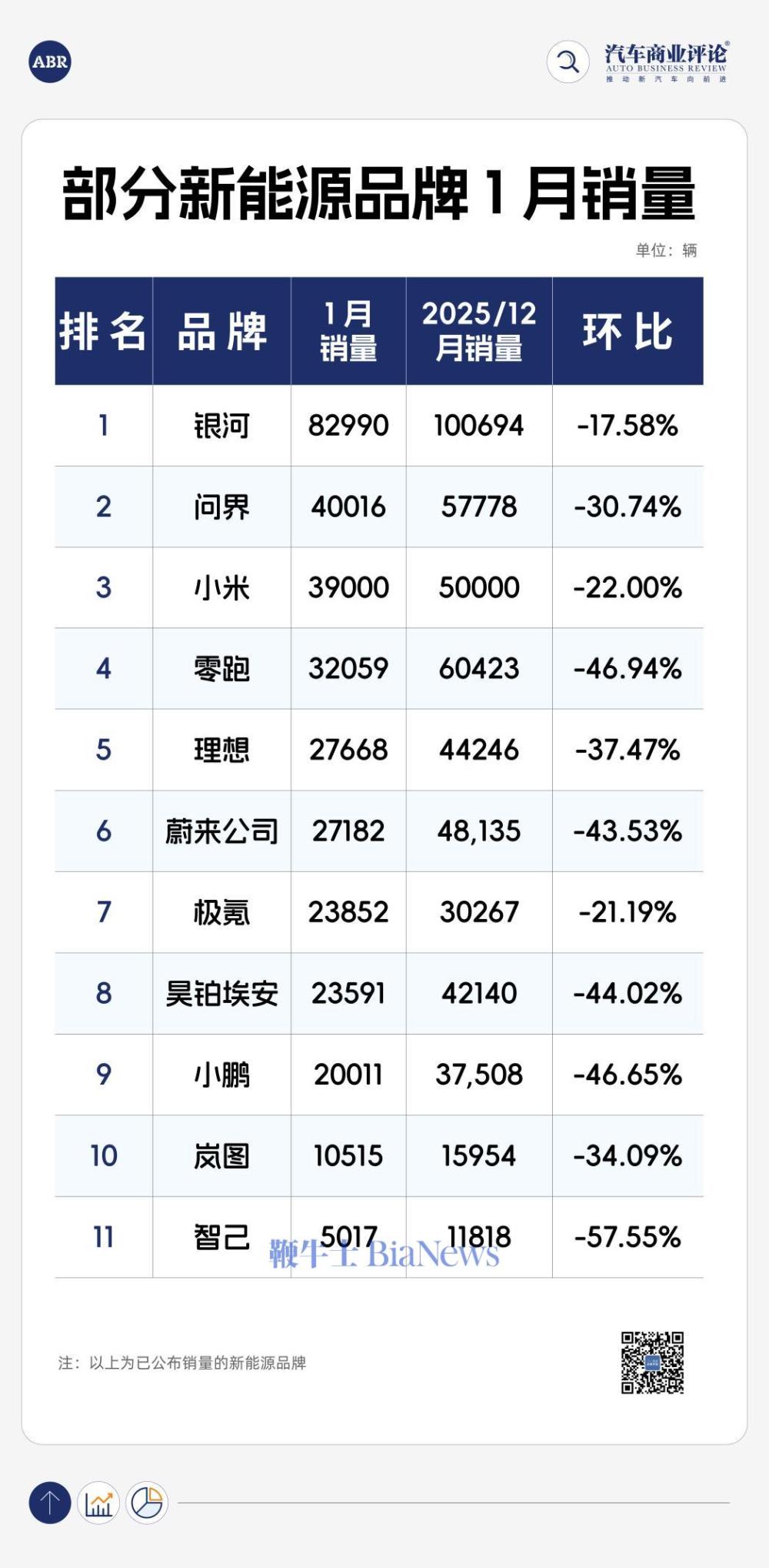 从已公布的销量看,2026年1月行业呈现两个特征,第一是头部新势力排名洗牌,第二是传统车企的“体系化能力”对冲淡季波动。
