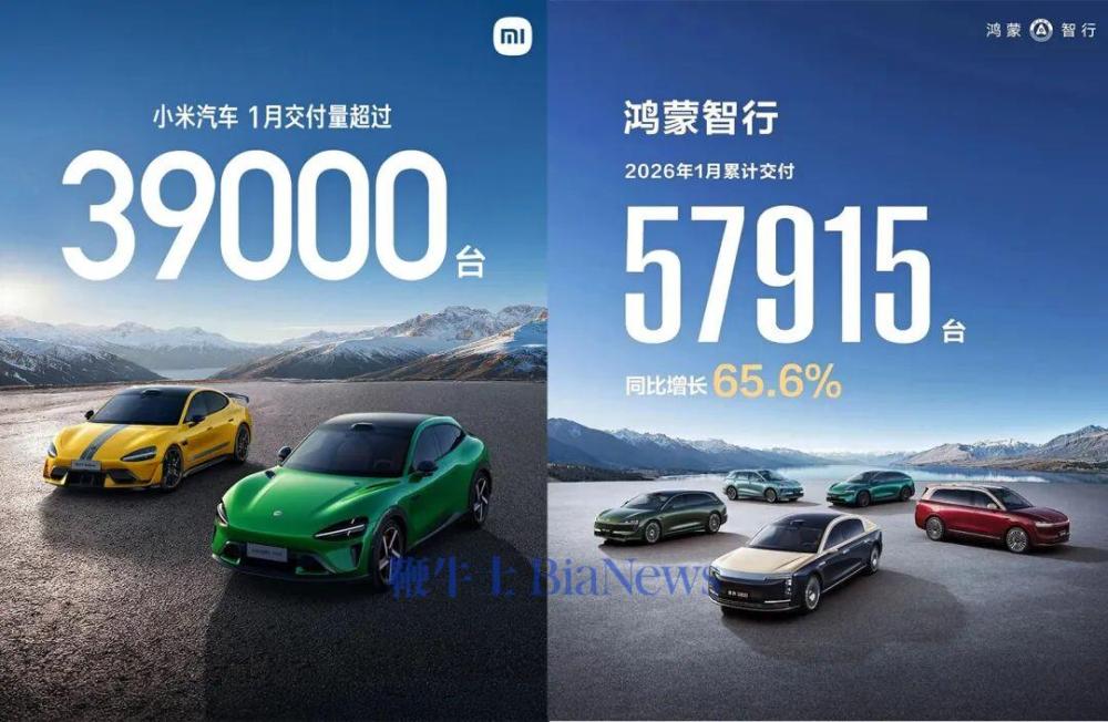 以“蔚小理”为定义的造车新势力阵营,目前真正排在第一位的是小米,其次是零跑,2026年1月销量分别是39000辆和32059辆,第三位是理想,销量为27668辆。蔚来紧随理想,销量为27182辆,小鹏则为20011辆。