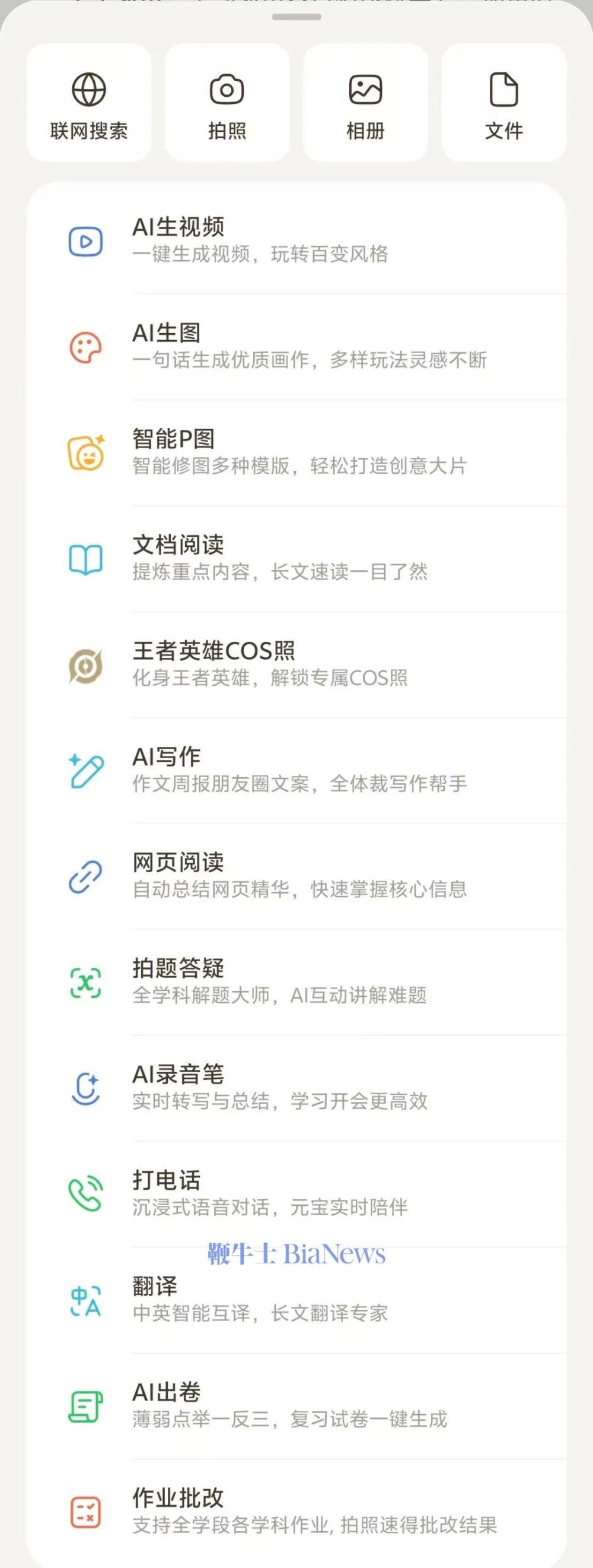 除了现在行业内热议的正在内测的“元宝派”功能之外,元宝App在整体产品的体验上都出现了较大优化,界面设计更加美观、简洁,功能也更加实用、好用。例如,其底部导航栏划分为“问元宝”、“派”、“创作”与“我们”四个版块,一目了然,与微信的呈现方式非常接近。尤其在“问元宝”的模块页面,其在文字/语音输入框的右侧设置了一个“+”按钮,点击“+”按钮,最上方的第一行分别是联网搜索、拍照、相册与文件四个横向排列的选择按钮,从第二行向下是依次排开的“AI生视频”、“AI生图”、“智能P图”、“文档阅读”、“AI写作”、“网页阅读”、“拍题答疑”、“AI录音笔”、“打电话”、“翻译”、“AI出卷”与“作业批改”等用户最常用的功能。