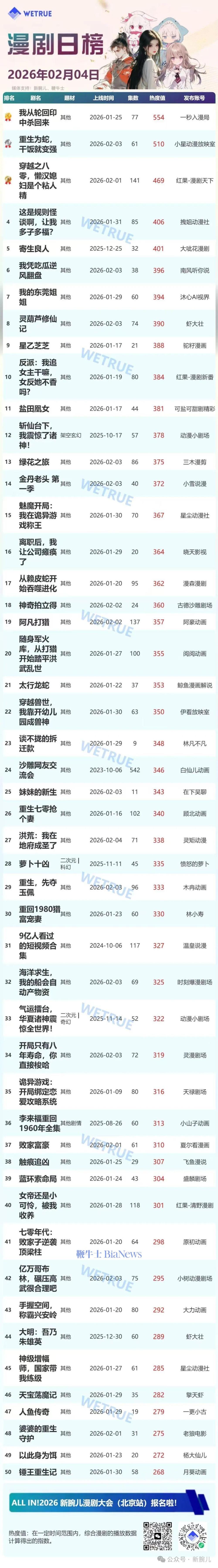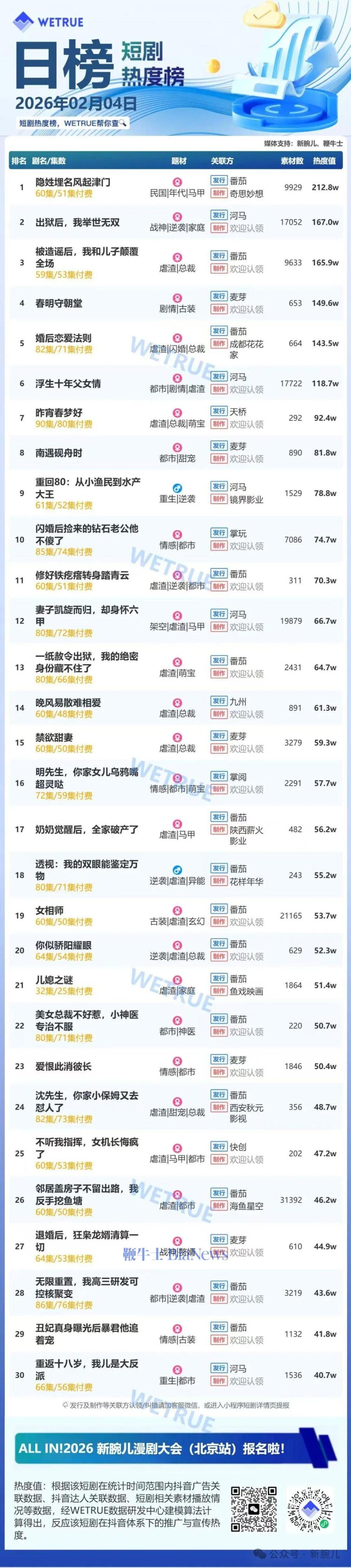 今天发布的是昨天(2月4日)漫剧及短剧付费大盘日榜。