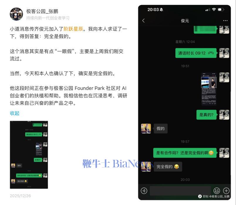 此前,网传前豆包 PC 负责人齐俊元在离开字节后加入阶跃星辰,负责手机相关业务。尽管随后极客公园创始人张鹏在社交平台晒出向齐俊元本人求证的“辟谣贴”,齐俊元以“完全假的”予以回应,但阶跃星辰官方并未对此作出任何公开说明。