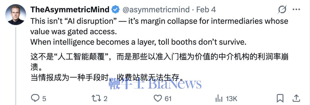 在很多投资者看来,SaaS公司本质上是一层中介:它们提前占据了某个入口,利用信息差和流程复杂度,向客户收取「过路费」。