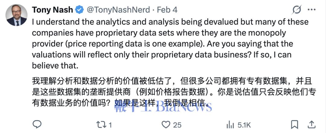 很多软件公司的股价都承受着巨大的压力,人们普遍认为AI会取代它们。这是世界上最不合逻辑的想法,时间会证明一切。