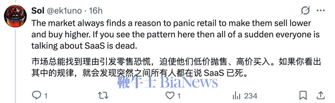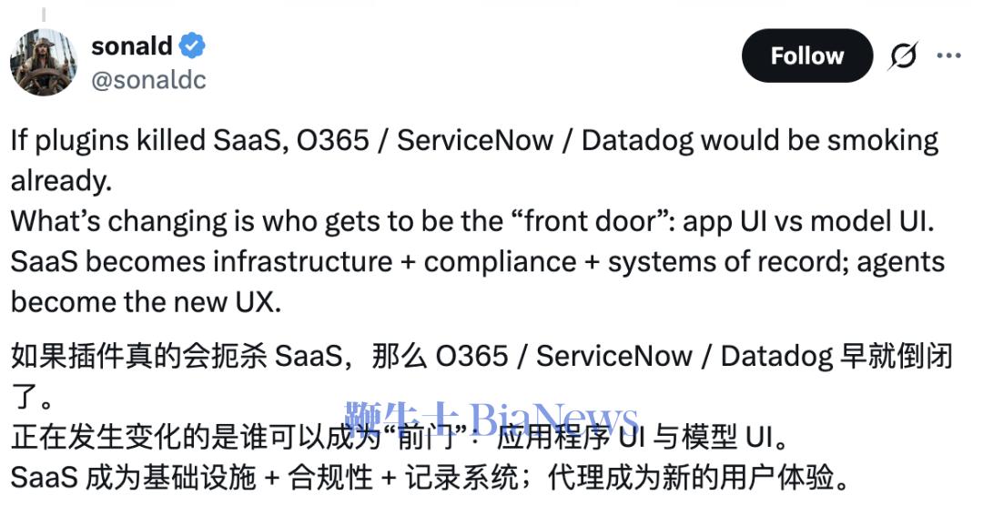 的确,如果AI真的这么容易就能扼杀SaaS,那Office 365、ServiceNow、Datadog早就该倒下了。