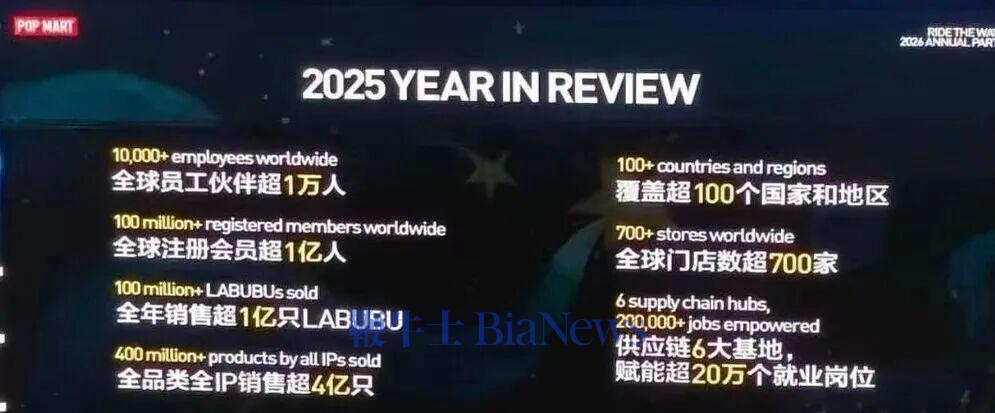 泡泡玛特全球员工伙伴超1万人、注册会员超1亿人、LABUBU全年销量超1亿只、全品类全IP产品销量超4亿只,业务覆盖100+国家和地区、全球门店超700家、拥有6大供应链基地并赋能超20万个就业岗位。