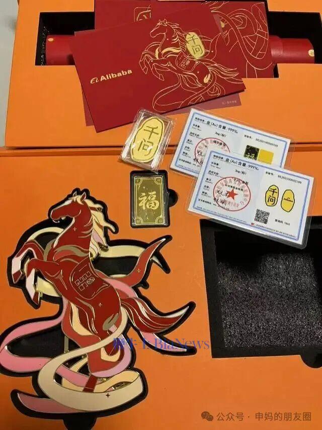 礼盒内包含一枚含有3mg纯金的千问金箔和一枚含有3mg纯金的千问金匙,另有若干千问红包和马年对联。