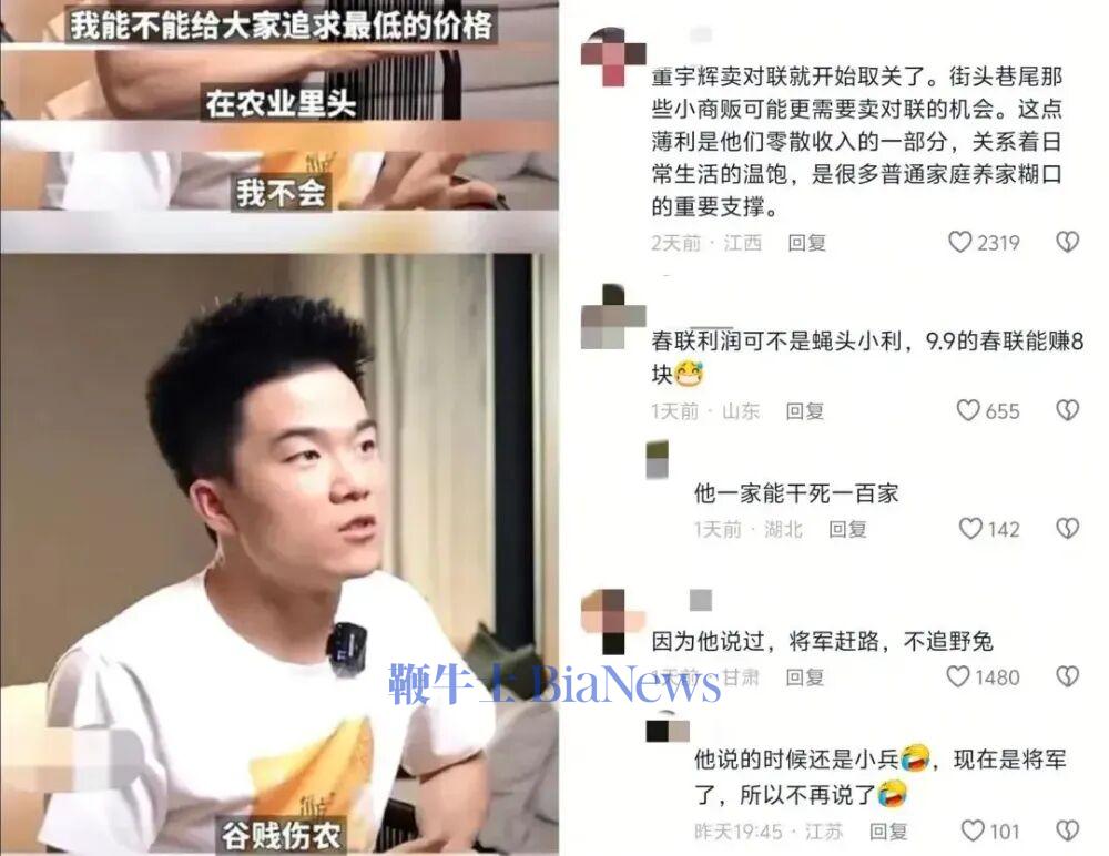 马年新春将至,家家户户忙着备春联、添年味。顶流主播董宇辉的直播间,也上架了几款平价春联。本是再普通不过的商业行为,却掀起了一场全网群嘲。评论区里,一句“这钱你也赚?”直击要害,裹挟着不满与失望,把董宇辉推上了舆论风口。有人说,网友太苛刻。直播带货赚钱天经地义,春联不是什么稀缺品,董宇辉凭流量带货,何错之有?可这场群嘲,从来不是针对“卖春联”这件事本身。网友愤怒的,是顶流人设与行为的割裂,是“体恤底层”的口号与“与民争利”的观感之间的落差。董宇辉的走红,从来都不是靠单纯的带货能力。在一众喧嚣的直播间里,他靠着出口成章的文案、温文尔雅的气质,立下了“体恤底层、心怀善意”的文人人设。他会为田间地头的农民发声,会在带货农产品时强调“让劳动者多赚一点”,会用温柔的话语安抚普通人的焦虑。正是这份“不一样”,让他在流量洪流中脱颖而出,收获了大众的信任与偏爱。大众愿意为他的人设买单,愿意在他的直播间消费,本质上是相信他能守住那份初心,相信他不会像其他顶流一样,被流量裹挟、被利益蒙蔽。