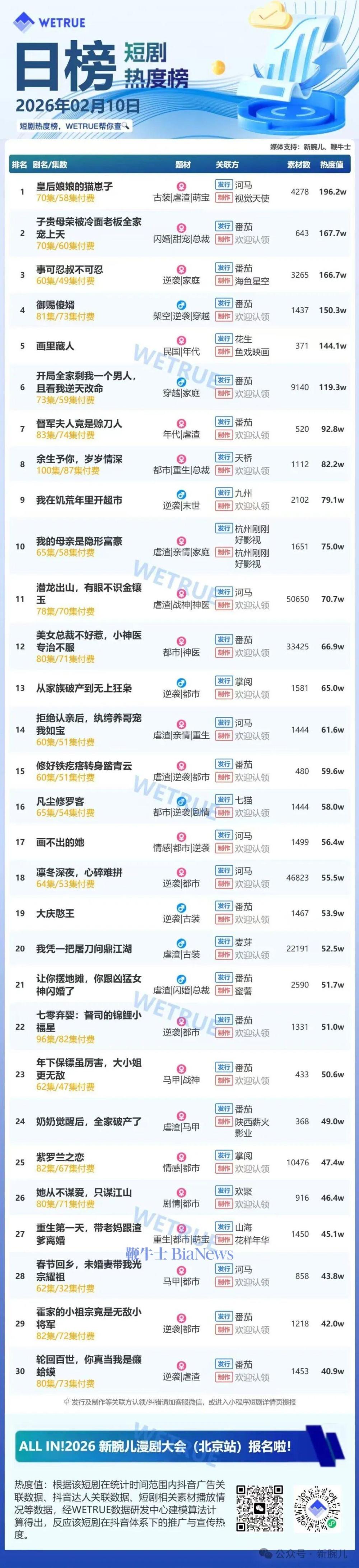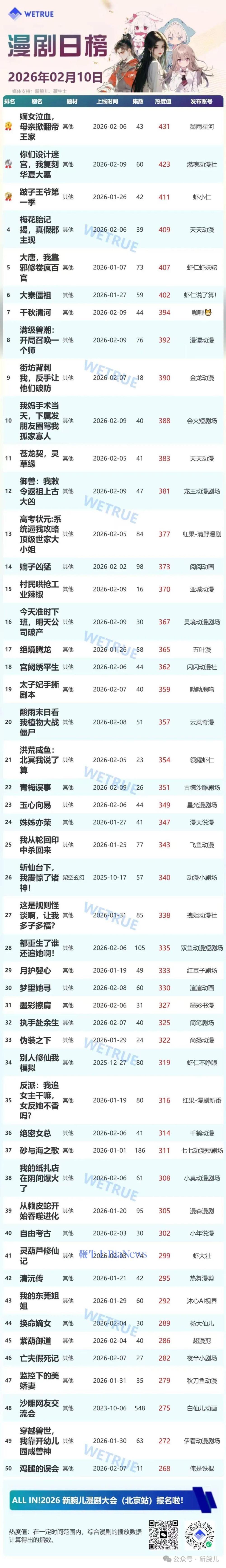 今天发布的是昨天(2月10日)漫剧及短剧付费大盘日榜。