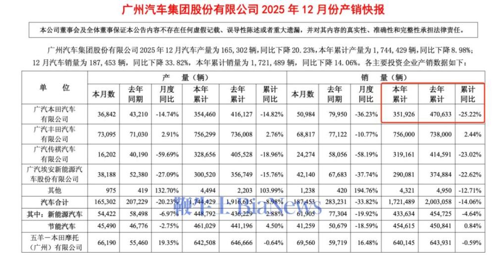 销量目标未完成, 广汽本田表现“最差” 在销量方面,2025年,广汽集团的汽车销量目标是在2024年200.31万辆的基础上增长15%,也就是230万辆左右。但是,其全年汽车实际销量约172.15万辆,同比下降14.06%。 具体到各子公司,广汽本田无疑是引起这次“暴跌”的症结之一。截至去年年底,广汽本田累计销量为35.19万辆,同比下降25.22%,是集团销量降幅最大的品牌。 进入2026年,广汽本田的销量仍未好转。据1月产销快报显示,广汽本田销量仅4558辆,同比暴跌69.86%。产量端广汽本田的表现更加不佳,1月仅生产了9331辆,同比下降65.05%,产量与销量的双降进一步反映出品牌正处于深度调整期。 若对比同在广汽集团内的其他子品牌,广汽本田的短板则更加明显。分企业看,广汽埃安1月销量2.16万辆,同比增长171.63%;广汽领程新能源商用车销量145辆,同比增长559.09%;广汽丰田销量6.26万辆,同比增长9.82%。 新能源旗舰月销仅千辆, 厂商或考虑减配 有业内人士认为,广汽本田落后的原因在于其没能跟上新能源转型浪潮。2024年,本田中国发布了全新电动品牌“烨”,这是本田为中国市场量身定制的纯电品牌。根据本田中国的官方解释,“烨”字寓意璀璨、闪耀。 然而推出不久,“烨”品牌就因为谐音梗风波而使销量一蹶不振。彼时,有大批网友指出“烨”字拆分后为“火华”,与“火化”谐音。在长沙方言中,“烨 P”谐音“嘢屁”,意思是“完蛋了”或“不行了”,被认为寓意不吉利。 面对舆论,广汽本田在去年的宣传海报中悄然隐去了“烨”字,“烨 P7”变成了“P7”,该车也是其主推的旗舰车型。10月,广汽本田推出直降5万元的促销活动,以期推动销量增长。事与愿违的是,新政推出后,“P7”的确迎来短暂回暖,但也仅仅徘徊在1000辆—1200辆间,并未有想象中的持续上涨。 该情况也得到了多位销售人员的进一步证实。北京市海淀区某4S店工作人员向《次世代车研所》表示,现在直降5万元的促销政策仍然存在,指导价为19.99万元的最低配车型现在起售价仅14.99万元,24.99万元的最高配起售价为19.99万元,同比降幅达25%。 通州区某4S店工作人员解释,最初上市时定价较高,导致销量并不理想,即便现在标配版本仍销量平平,原本的六种颜色也被“砍”得只剩下白色选项。 从库存角度看,“P7”的动销也不乐观。据该工作人员解释,市场上的库存新车生产日期普遍在7月前后,最晚到8月。即便消费者定了新车,大概率也是从厂家库房中发出已生产好的现车,“只考虑新日期的车可能很难买到”。 该工作人员还透露,“由于指导价与实际售价差值过大,成本或难以覆盖,后续的广汽本田P7正在考虑减配。” 黄河科技学院客座教授、国际智能运载科技协会秘书长张翔表示,一方面,燃油车市场受到挤压,大环境较差;另一方面,广汽本田的新能源车型少,且销量差,未能有效拉动销量,也错过了新能源的时代红利。同时,广汽本田的营销方法比较老套,很难适应时代的发展。 张翔指出,当下的新势力及传统车企都在搞新零售,并通过商超卖车。广汽本田仍然按兵不动,坚持做传统的线下经销商模式,使得其流量很低,品牌知名度逐年削弱。(转载自新浪科技)