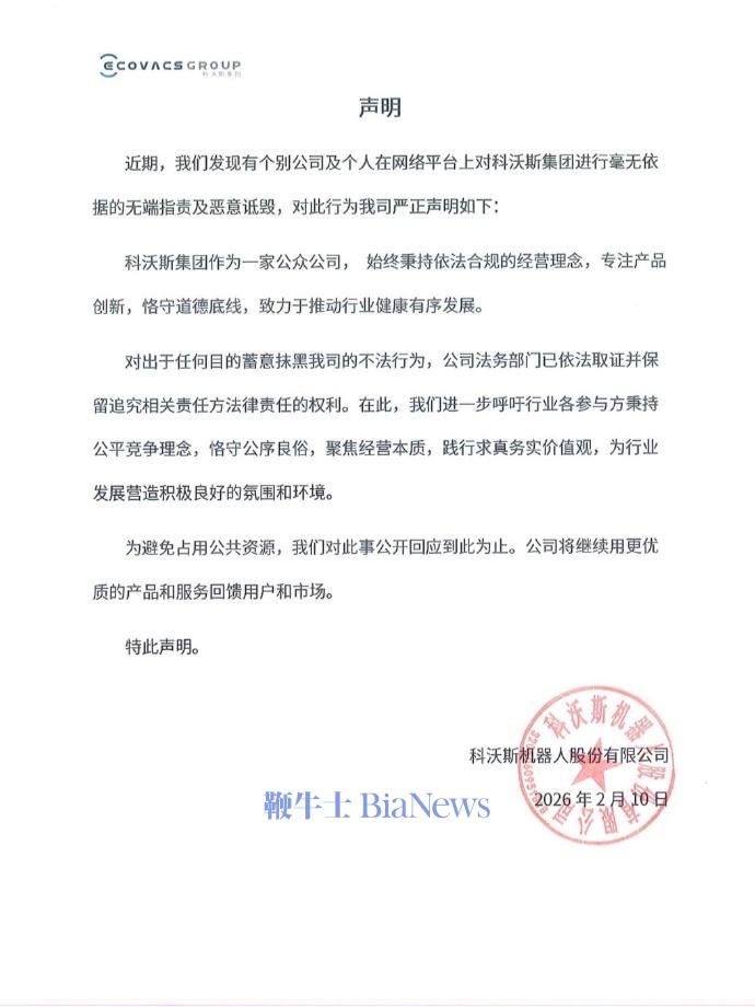 科沃斯集团表示,作为一家公众公司,始终秉持依法合规的经营理念,专注产品创新,恪守道德底线,致力于推动行业健康有序发展。