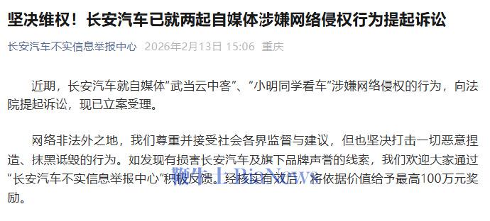 2月13日,长安汽车官方声明,近期,长安汽车已就自媒体“武当云中客”、“小明同学看车”涉嫌网络侵权的行为,向法院提起诉讼,现已立案受理。