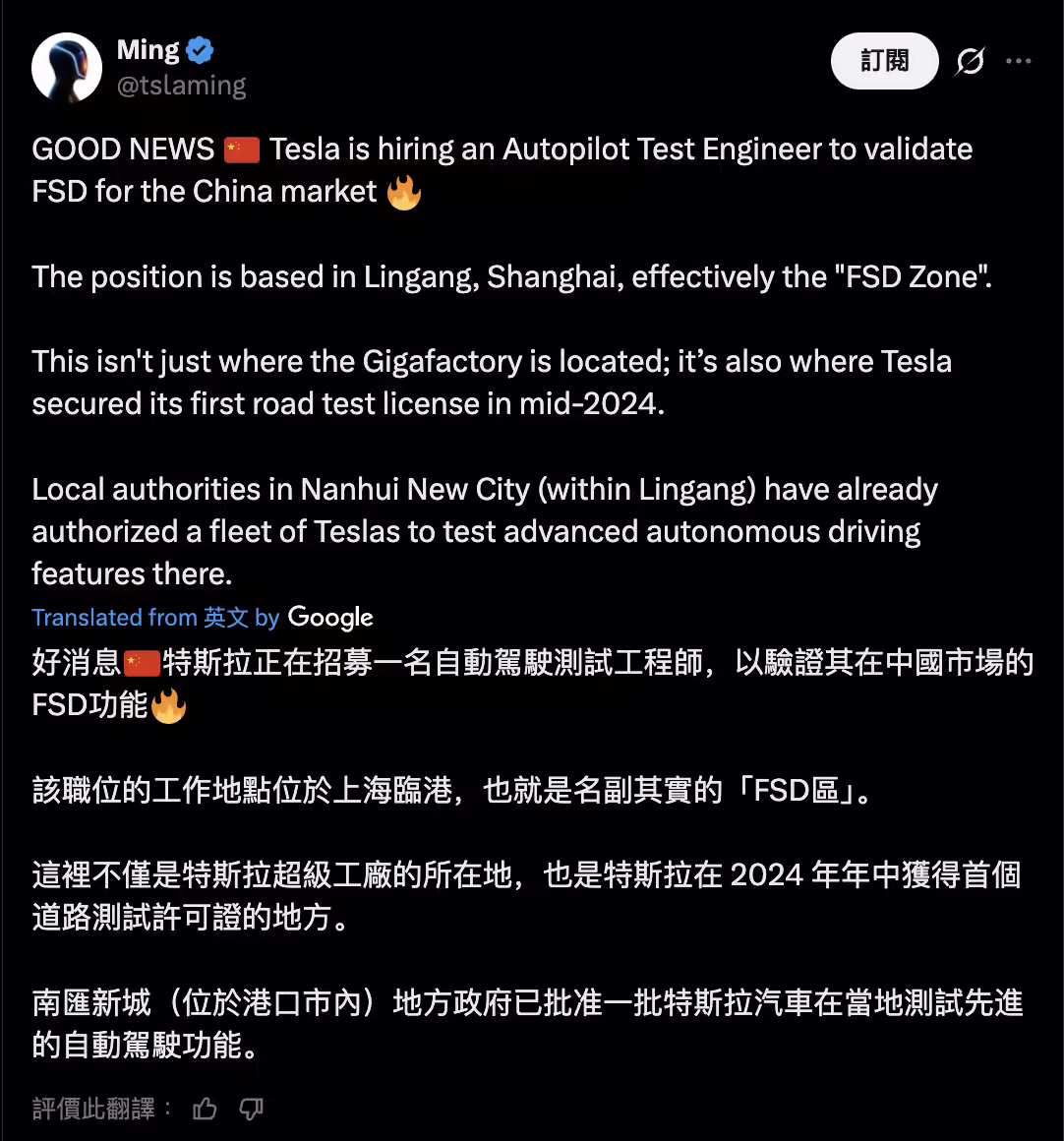 X 平台用户 @tslming 对此解读道,特斯拉此举旨在中国市场验证 FSD 功能,特斯拉的超级工厂本身就位于临港新区,且该公司还在 2024 年年中获得了首个道路测试许可证。