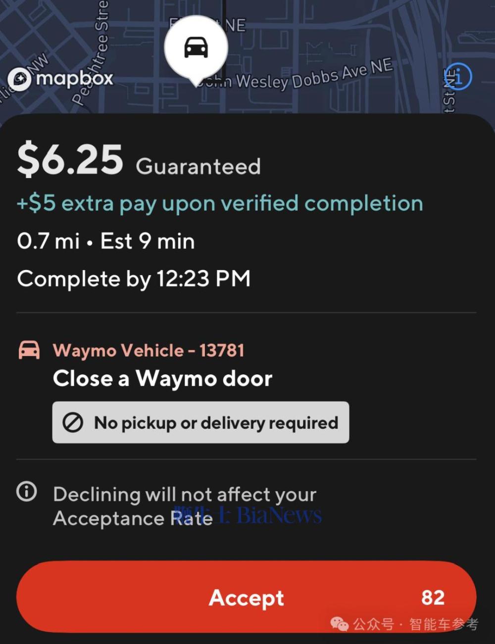 司机无需送餐,只需要到距其1公里的一辆Waymo无人车旁边,把车门关上,就能获得6.25美元的报酬。