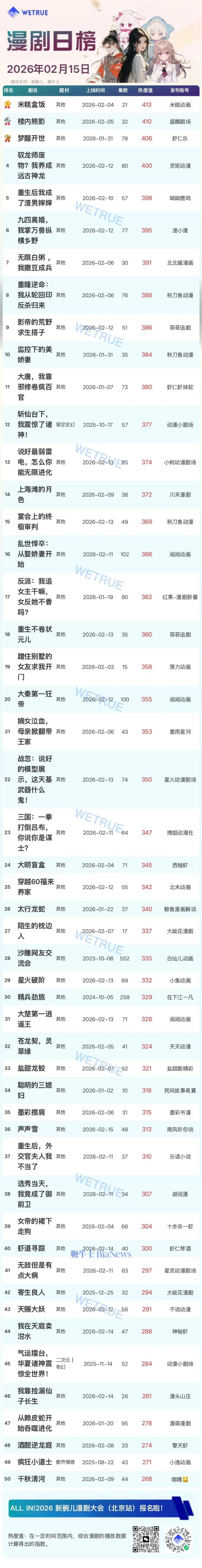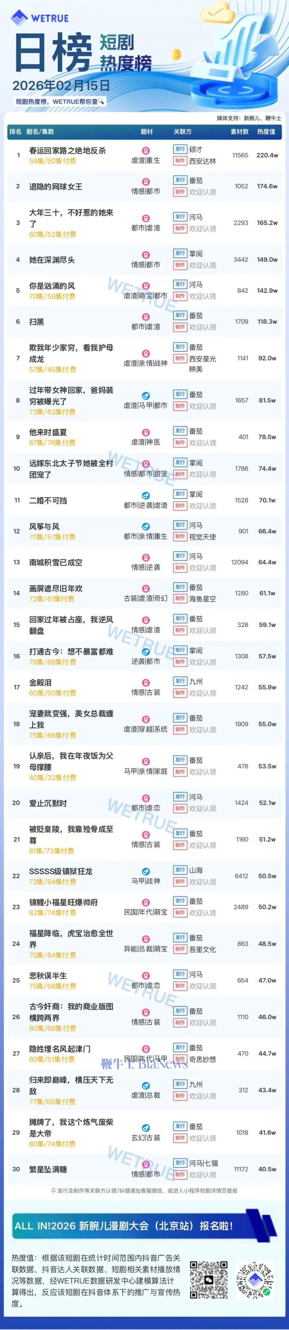 今天发布的是昨天(2月15日)漫剧及短剧付费大盘日榜。