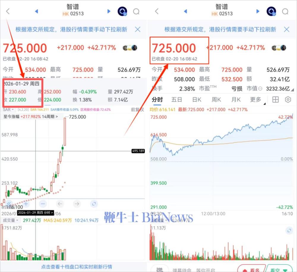 2月20日,马年港股开市首日,大模型公司智谱股价大幅度上涨,收报725港元/股,上涨42.72%,市值突破3232亿港元。