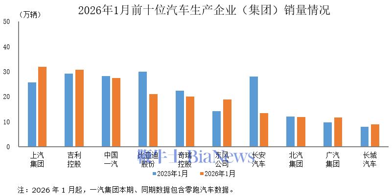 中汽协:1月汽车销量前十企业共销售196.2万辆,占总量83.6%