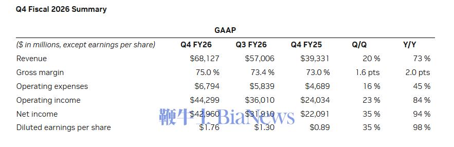 2月26日,英伟达公布2026财年第四财季(对应自然年2025年第四季度)及全年业绩,受益于AI算力需求的扩张,英伟达各项财务指标均超出市场预期。