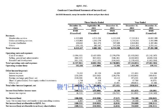 不过,成本管控的成效未能抵消营收下滑的影响,2025年爱奇艺盈利指标出现明显恶化。