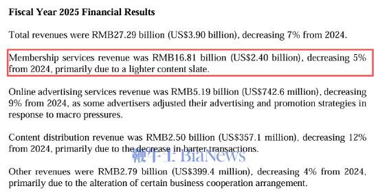 更愁的是会员服务的下滑。财报显示,2025年其会员服务收入为168.1亿元,同比下滑5%。作为第二大板块,在线广告服务同样面临下滑压力,2025年营收为51.9亿元,同比下滑9%。