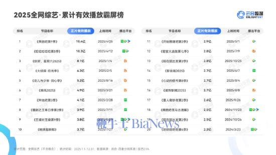 而2025年全网网络综艺有效播放霸屏榜前10部综艺中,爱奇艺独播的《种地吧3》《喜剧之王单口季2》上榜,有效播放量分别为4.1亿和3.9亿。不过,作为“综N代”,两个IP续作播放量均有所下滑,2024年《种地吧2》和《喜剧之王单口季》播放量分别为5.6亿和4.7亿。