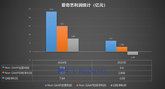 爱奇艺虽然连续4年实现运营盈利,2025年Non-GAAP运营利润为6.4亿元,不过较2024年的23.6亿元下滑约73%,Non-GAAP归属于爱奇艺的净利润2.806亿元,2024年为15.1亿元,而归属于爱奇艺的净利润则由盈转亏,2025年归属于爱奇艺净亏损为2.06亿元,2024年同期为净利润7.64亿元。