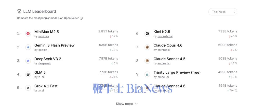 2026 年 2 月 24 日,OpenRouter 发布了一份周度数据:平台前十模型的总 Token 消耗约 8.7 万亿,中国模型独占 5.3 万亿,占比 61%。MiniMax M2.5 以 2.45 万亿 Token 空降榜首,Kimi K2.5、智谱 GLM-5 紧随其后,前三名清一色来自中国。