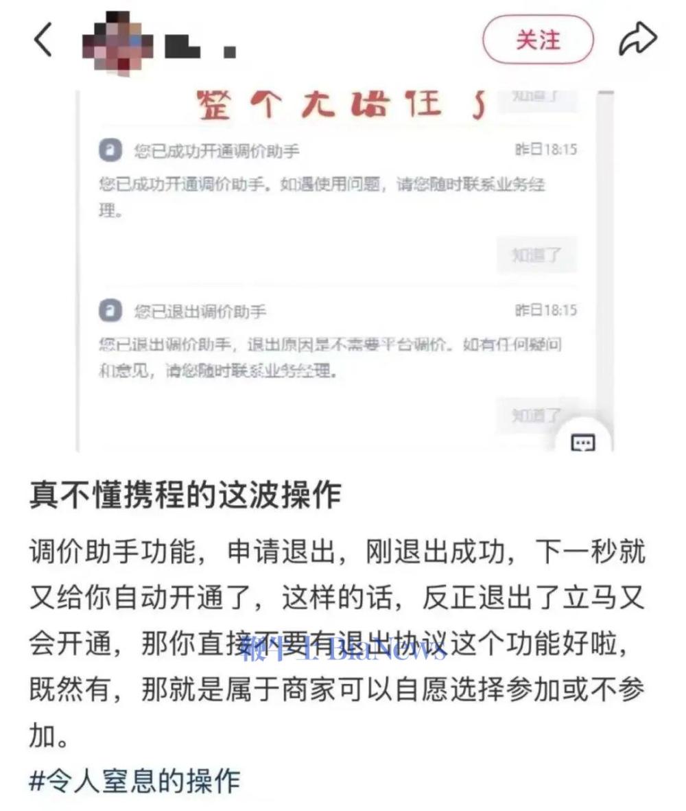 这玩意儿是所有酒店老板的痛,携程可以直接越过酒店老板,擅自修改酒店房价,商家只能被迫接受。随便一搜,就可以看到类似武汉某酒店上千元的房型被系统强行降到500元去卖的新闻。
