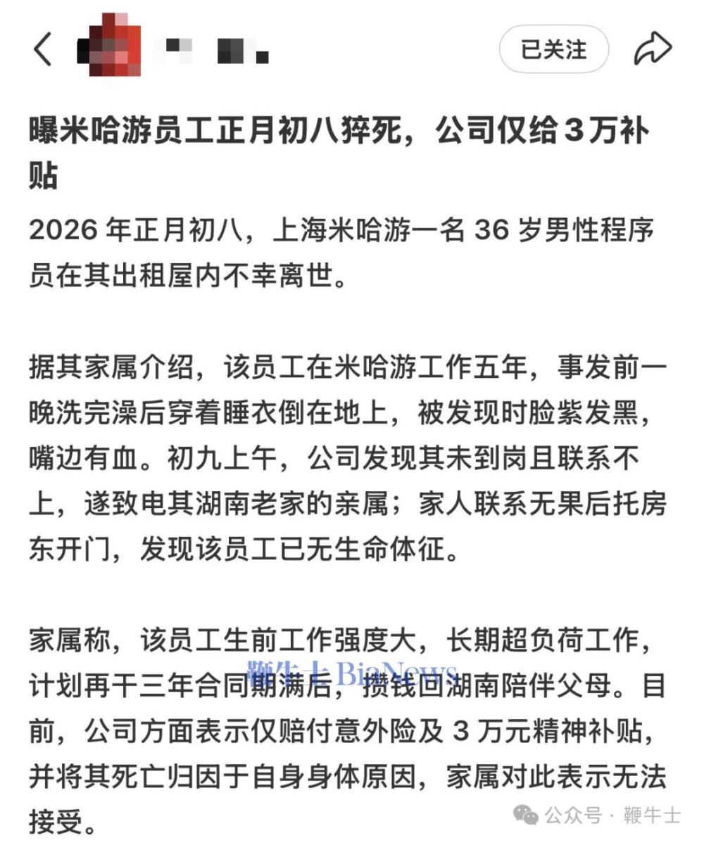 2月27日,有博主爆料,一名米哈游员工正月初八在出租屋内猝死,公司仅赔偿3万补贴及意外险。
