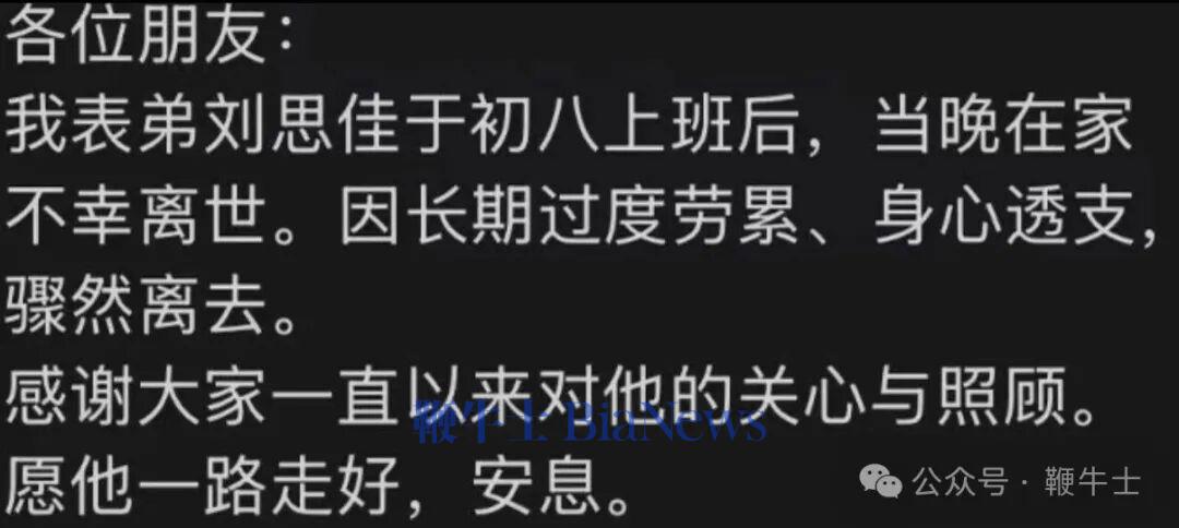 该员工家属在朋友圈发文表示,表弟于初八上班后,当晚在家不幸离世。因长期过度劳累、身心透支,骤然离去。