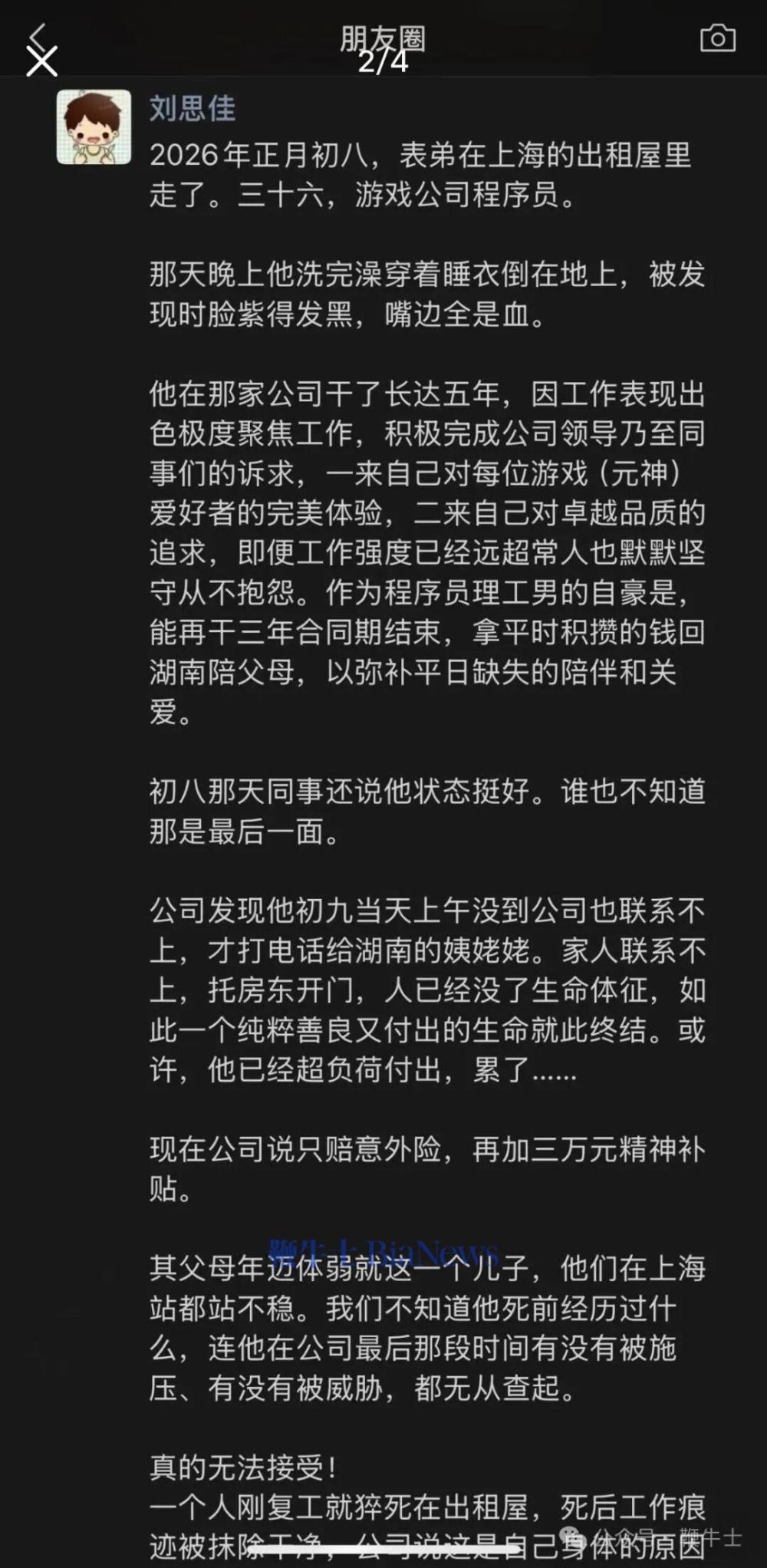 家属表示,自己的表弟是上海一名36岁游戏公司程序员,于正月初八在出租屋内不幸离世,其生前长期超负荷工作,而涉事公司仅赔付意外险及3万元补贴。