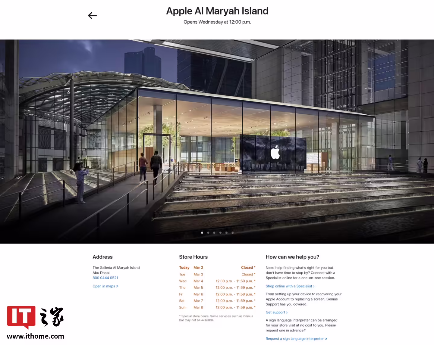 3 月 2 日消息,苹果官网显示,其已暂时关闭其位于阿联酋的全部 5 家 Apple Store 零售店,涵盖阿布扎比 3 家门店和迪拜 2 家门店。