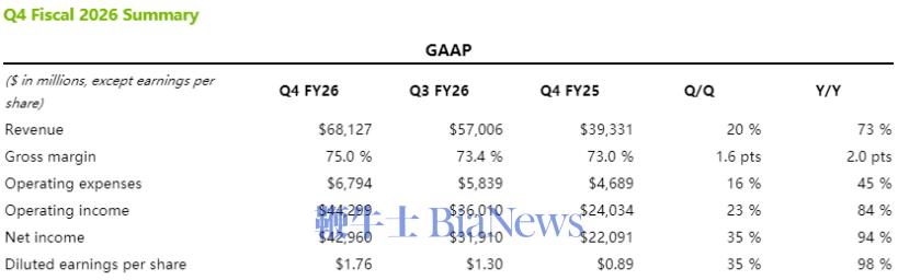 得益于Blackwell等新品的快速放量,英伟达本财季毛利率达到75.2%,同比提升1.7个百分点,环比提升1.6个百分点,创2025财年第二财季以来单季新高。