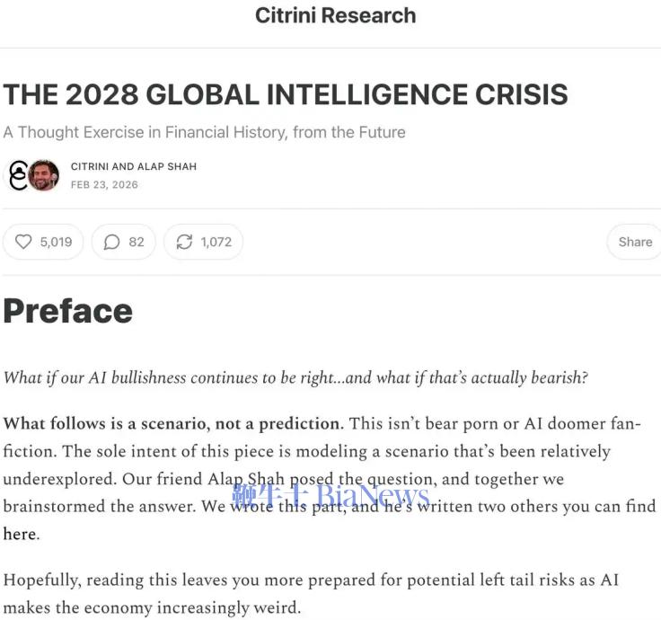2026年2月22日,独立研究机构Citrini Research发布了一份长达7000字的假设性情景分析报告。这份名为《2028年全球智能危机》报告指出,若AI技术发展超预期,则可能会在2028年导致白领大规模失业、消费崩塌,进而引发系统性经济崩溃。报告发布次日,美股三大指数均遭到重挫,其中ServiceNow、DoorDash等被点名企业的股价纷纷暴跌。