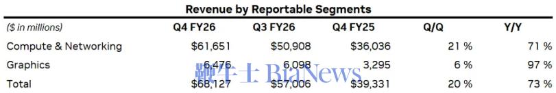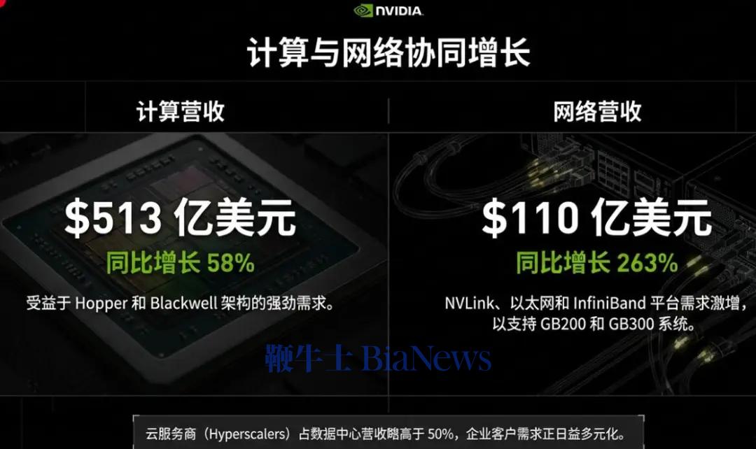 2025年第四季度,英伟达计算业务实现营收513亿美元,同比增长58%,为公司贡献了最大的营收增量,主要得益于Blackwell和Blackwell Ultra产品的产能持续释放。