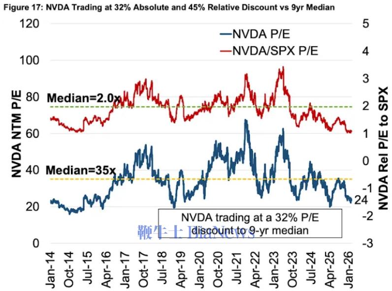 事实上,就在本次财报数据公布之前,英伟达已经经历了长达四个月的盘整,公司动态市盈率水平也随着公司业绩的高速增长而出现了明显的回落。最新数据显示,英伟达的远期市盈率已回落至24倍以下,接近五年来的最低点,且远低于38倍的五年平均水平。