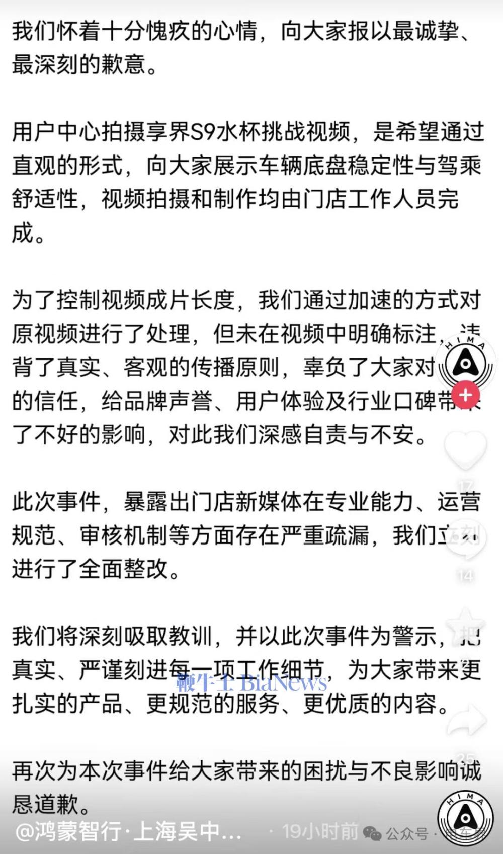 为了控制视频成片长度,通过加速的方式对原视频进行了处理,但未在视频中明确标注,违背了真实、客观的传播原则,辜负了大家的信任,给品牌声誉、用户体验及行业口碑带来了不好的影响,对此深感自责与不安。