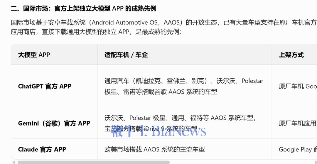 据豆包PC端的研究级智能模型给出的结果:国际市场已有第三方通用大模型独立 APP 在原厂车机官方应用商店上架的成熟规模化先例;国内市场暂无第三方通用大模型独立 APP 在主流车企原厂车机应用商店官方上架的合规先例,仅存在车企自研大模型独立 APP 原厂上车、第三方大模型底层能力系统级集成两类合规落地形式。