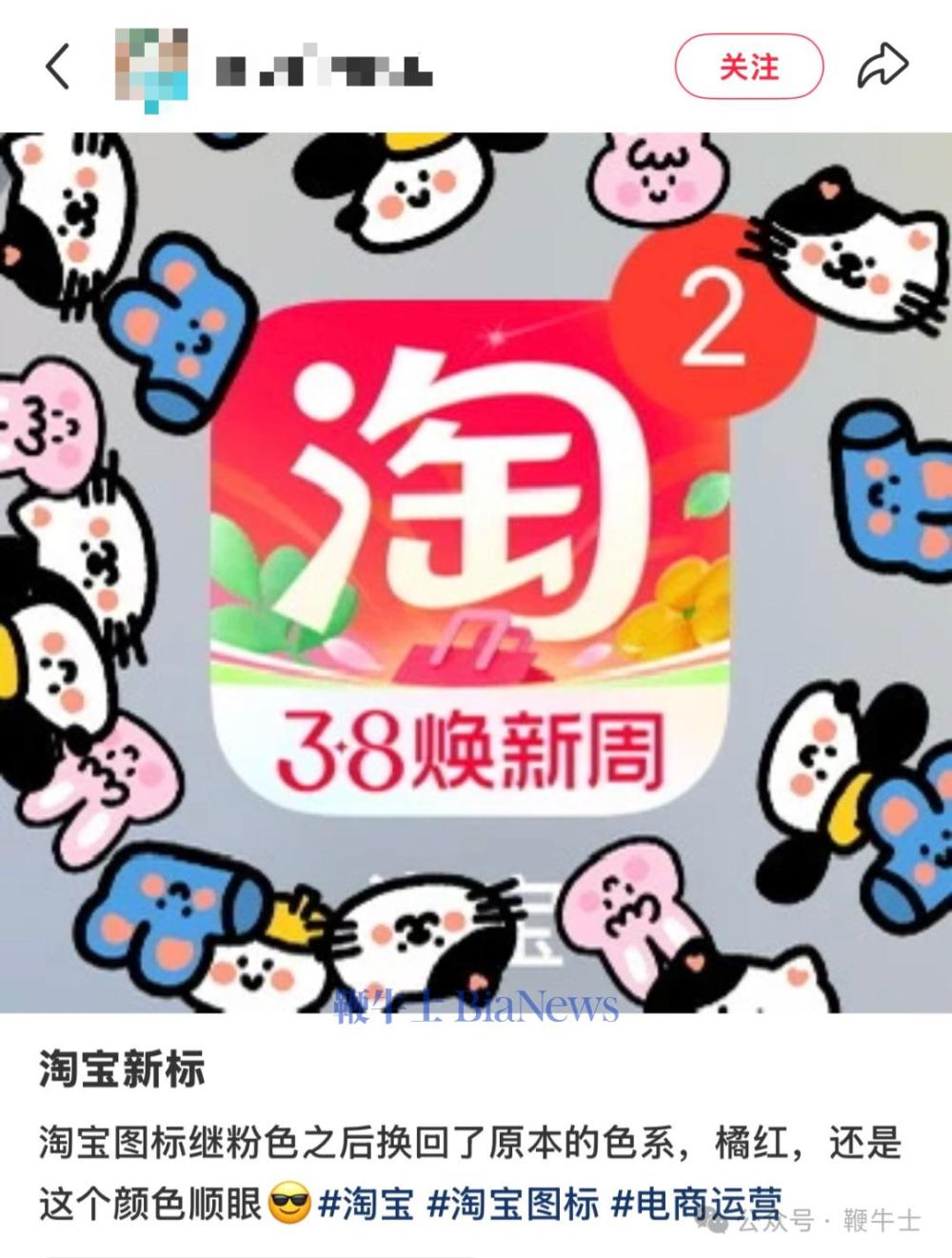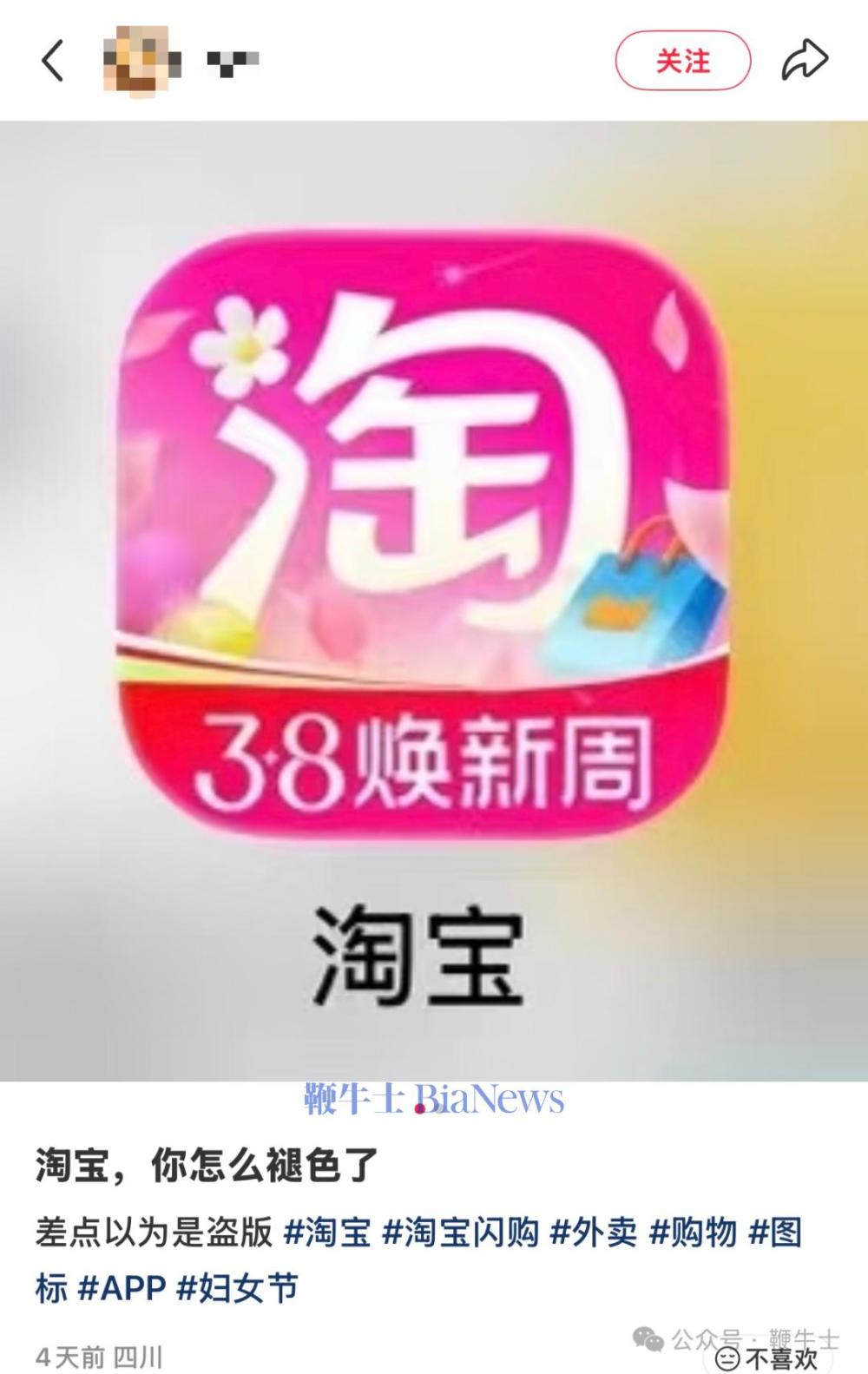 为彰显节日氛围,淘宝APP将图标换成了粉色背景色,并配上白色“3.8焕新周”的字体样式。