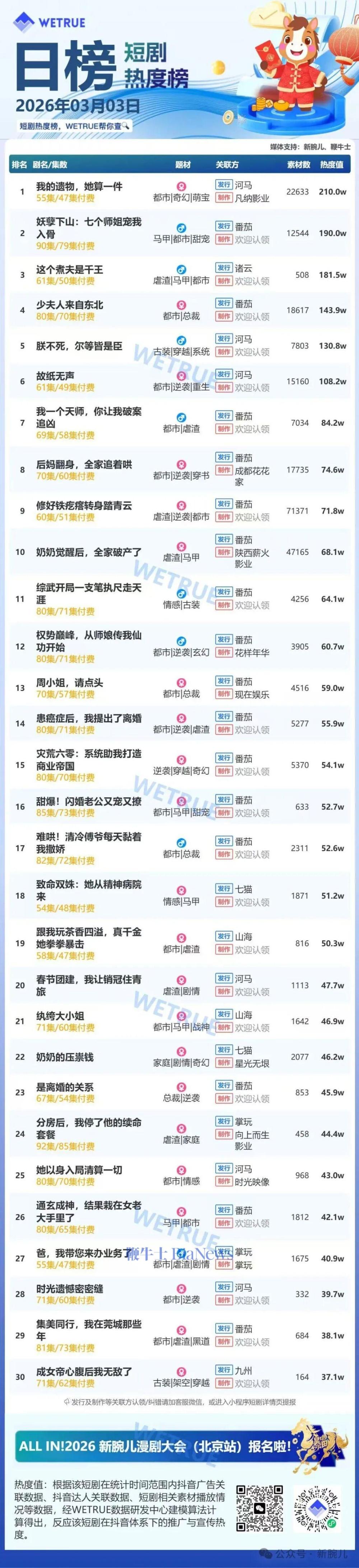 今天发布的是昨天(3月3日)漫剧及短剧付费大盘日榜。