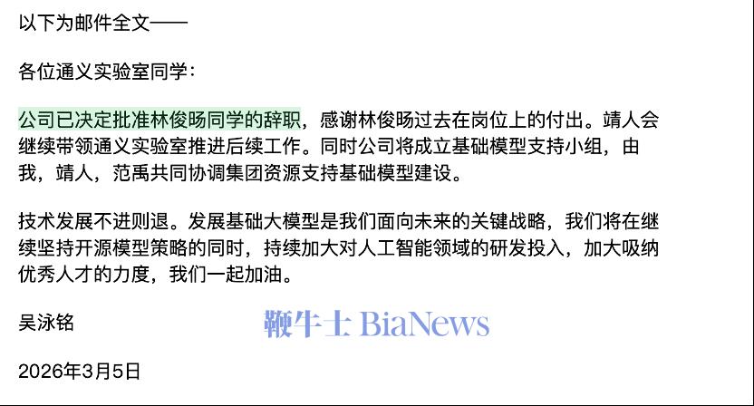 今天上午,阿里巴巴 CEO 吴泳铭发布内部邮件,正式回应千问大模型核心负责人林俊旸离职事件,宣布成立由高层直接牵头的基础模型支持小组,持续加大 AI 研发投入与人才吸纳力度,同时宣布公司已决定批准林俊旸同学辞职。