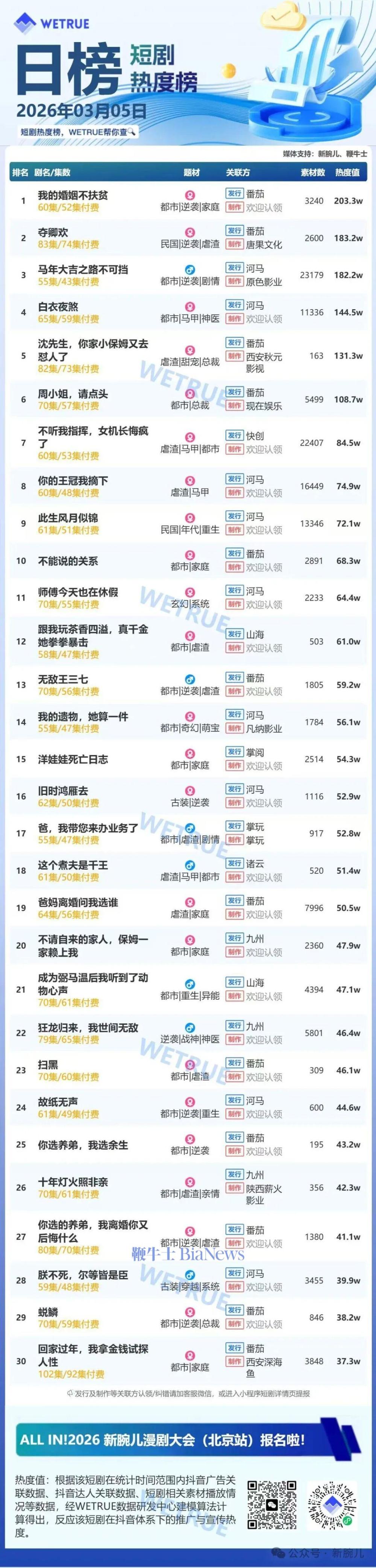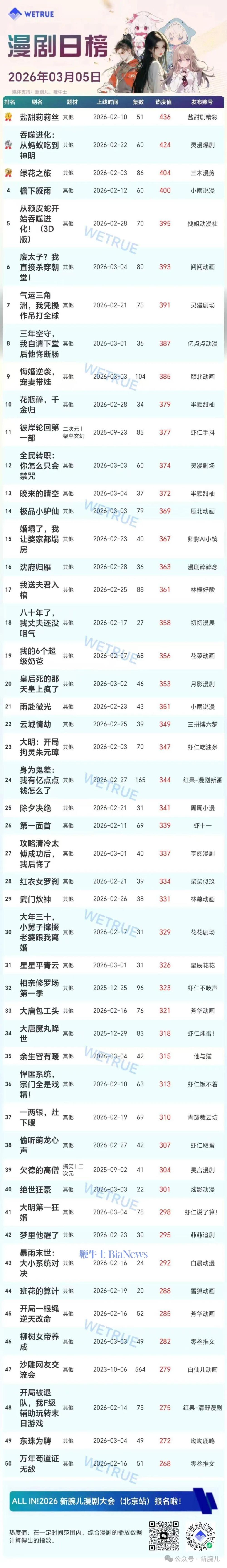 今天发布的是昨天(3月5日)漫剧及短剧付费大盘日榜。