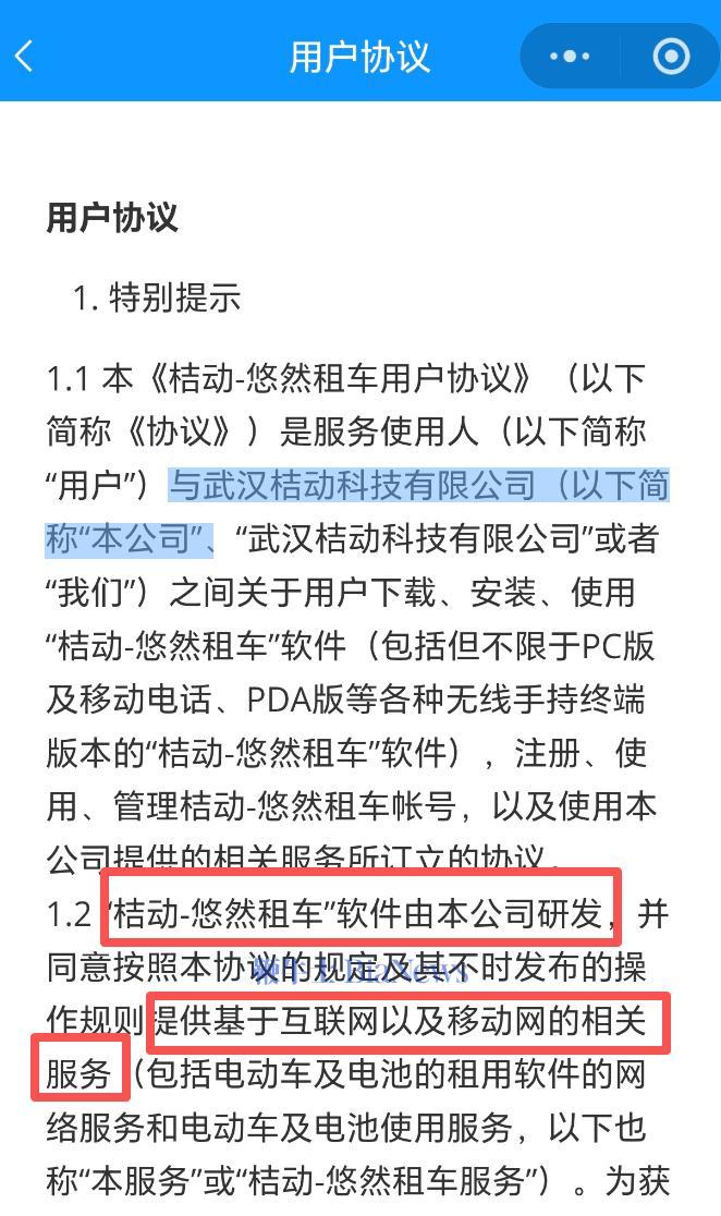 悠然租车服务协议内容显示,悠然租车由武汉桔动科技有限公司研发,而该公司为杭州青奇科技有限公司的全资子公司。