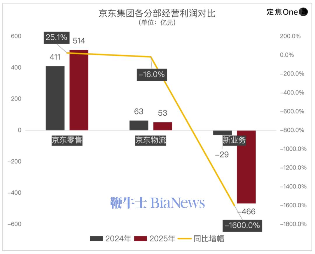 2025年,京东在外卖、社区团购(京喜)和海外电商等新业务上,合计经营亏损高达466亿元,相比2024年29亿的亏损额,扩大了15倍以上。