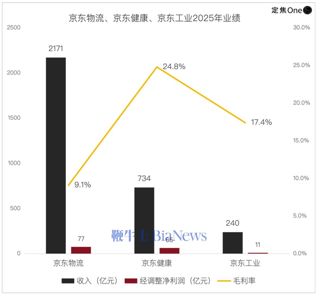 京东健康赚钱、京东工业慢涨