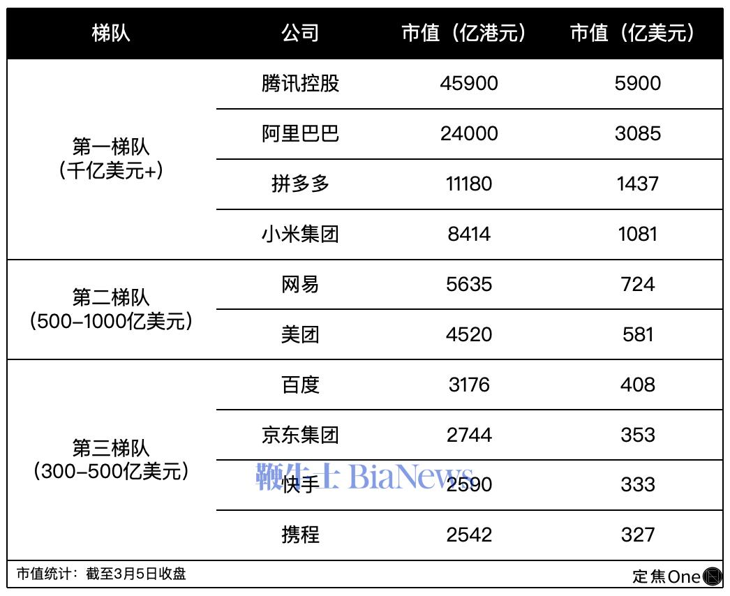 以截至3月5日收盘的市值来看,腾讯、阿里、拼多多、小米属于第一梯队,网易、美团位于第二梯队;京东和百度、快手、携程同处第三梯队。
